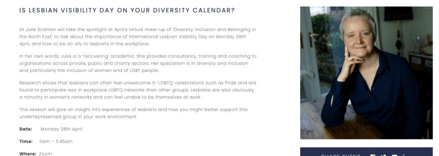 Really excited for Lesbian Visibility Day, April 26th, this year. I’m giving a talk ‘Is Lesbian Visibility Day in your Diversity Calendar?’ for the Diversity, Inclusion and Belonging in the North East network. You can find out more here.